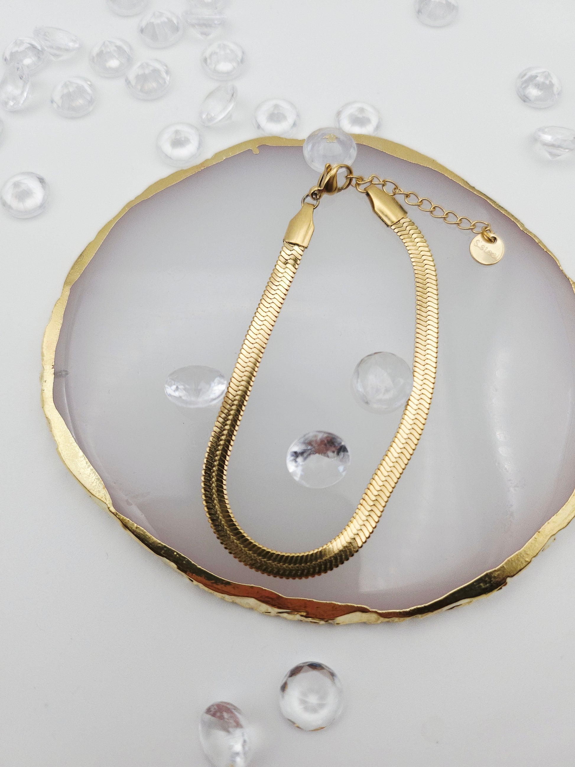 Ce bracelet est composé d'une chaîne large de style maille gourmette, avec des maillons plats et lisses qui reflètent la lumière de manière intense et élégante. 🔗 Sa surface dorée et polie lui confère un aspect chic et luxueux. Le bracelet est ajustable, grâce à une chaîne d'extension délicate, ce qui vous permet de l'adapter parfaitement à votre poignet. ✨