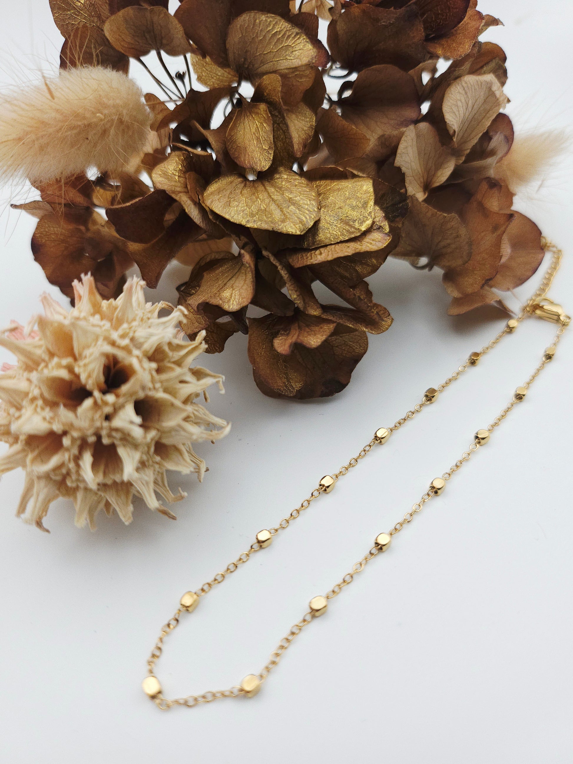 Cette chaîne fine et dorée est ponctuée de petites perles dorées, régulièrement espacées, qui captent la lumière à chaque mouvement. Ces petites sphères brillantes créent un jeu de lumière subtil et un design à la fois minimaliste et sophistiqué. 🌟