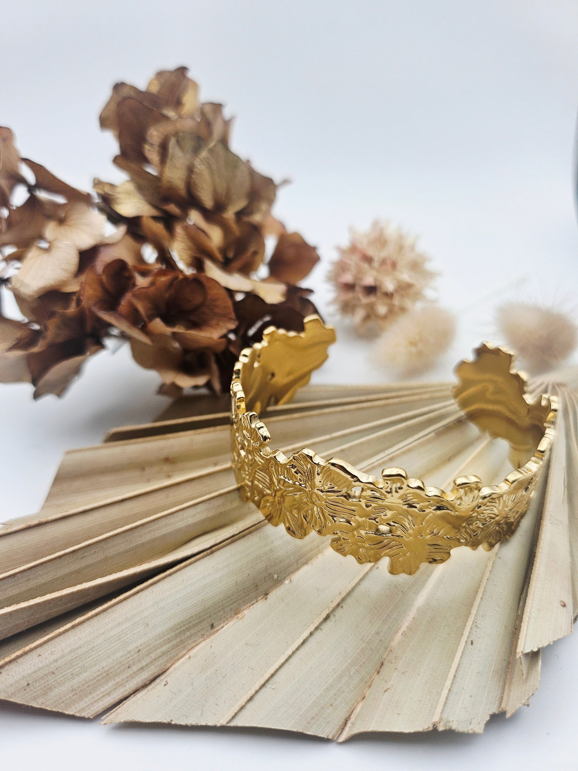 Ce jonc, avec son design large et ouvert, est entièrement orné de motifs de feuilles et de fleurs de nénuphars finement découpés. Chaque feuille présente une texture subtile, comme si elle venait tout juste d'être cueillie. Le motif ajouré apporte une légèreté inattendue à ce bracelet large, tout en créant un jeu d'ombre et de lumière sur votre peau. ☀️