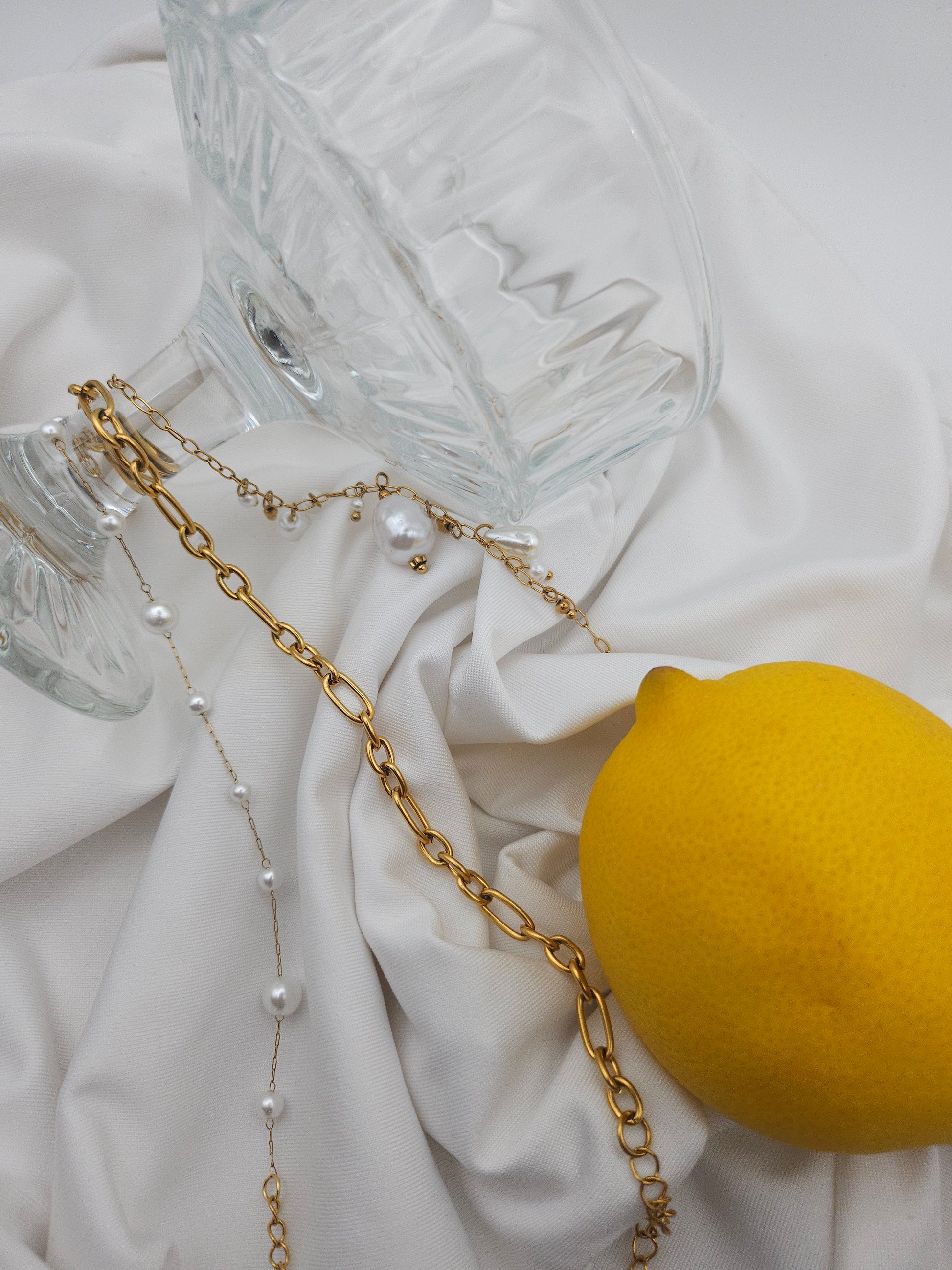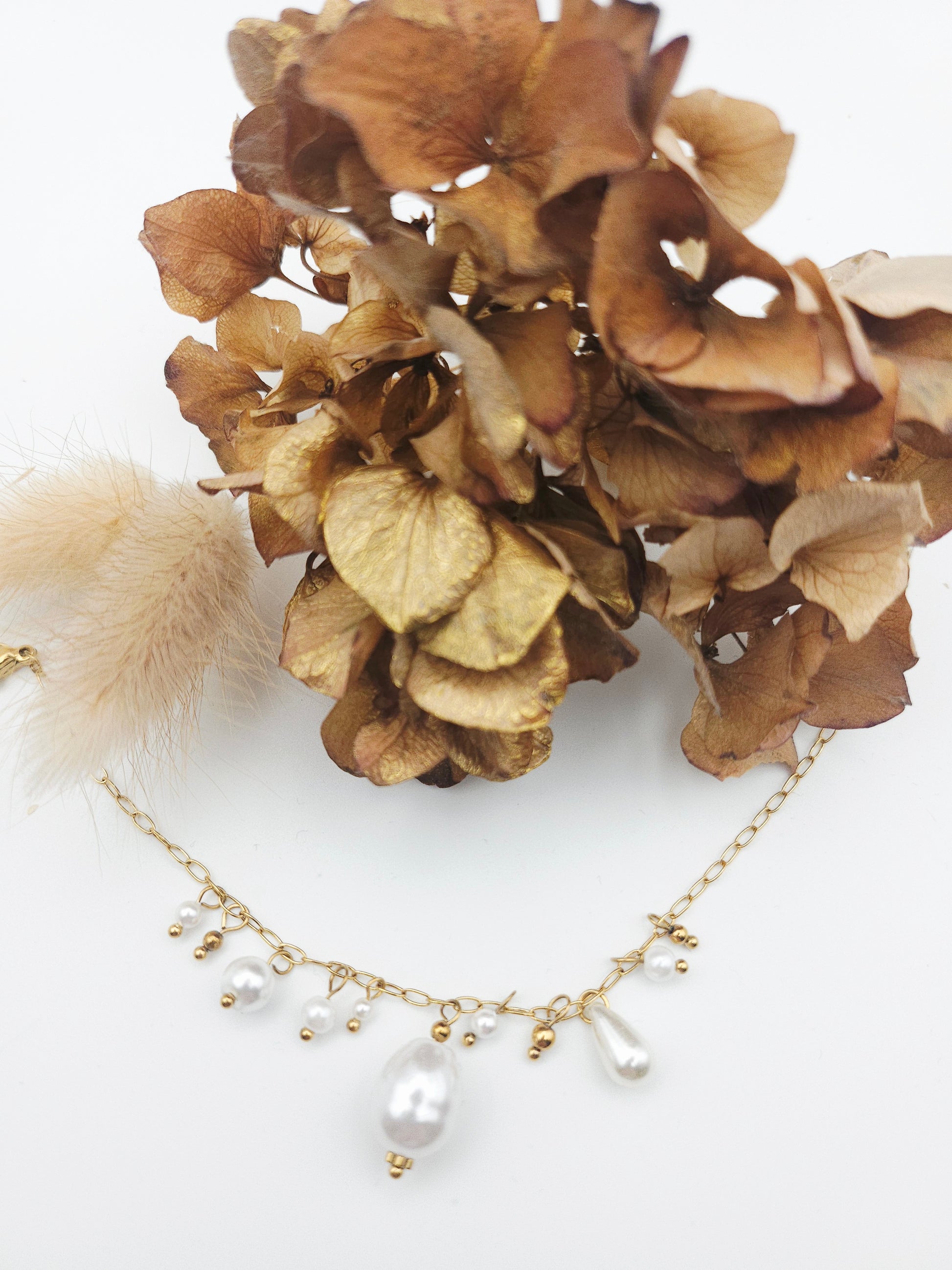 Le bracelet est composé d'une fine chaîne dorée qui soutient une série de petites perles d'un blanc nacré. Chaque perle, avec ses reflets irisés, capte la lumière d'une manière unique, créant un effet lumineux et raffiné. Ces perles, d'une blancheur éclatante, apportent une touche de sophistication intemporelle. 🐚