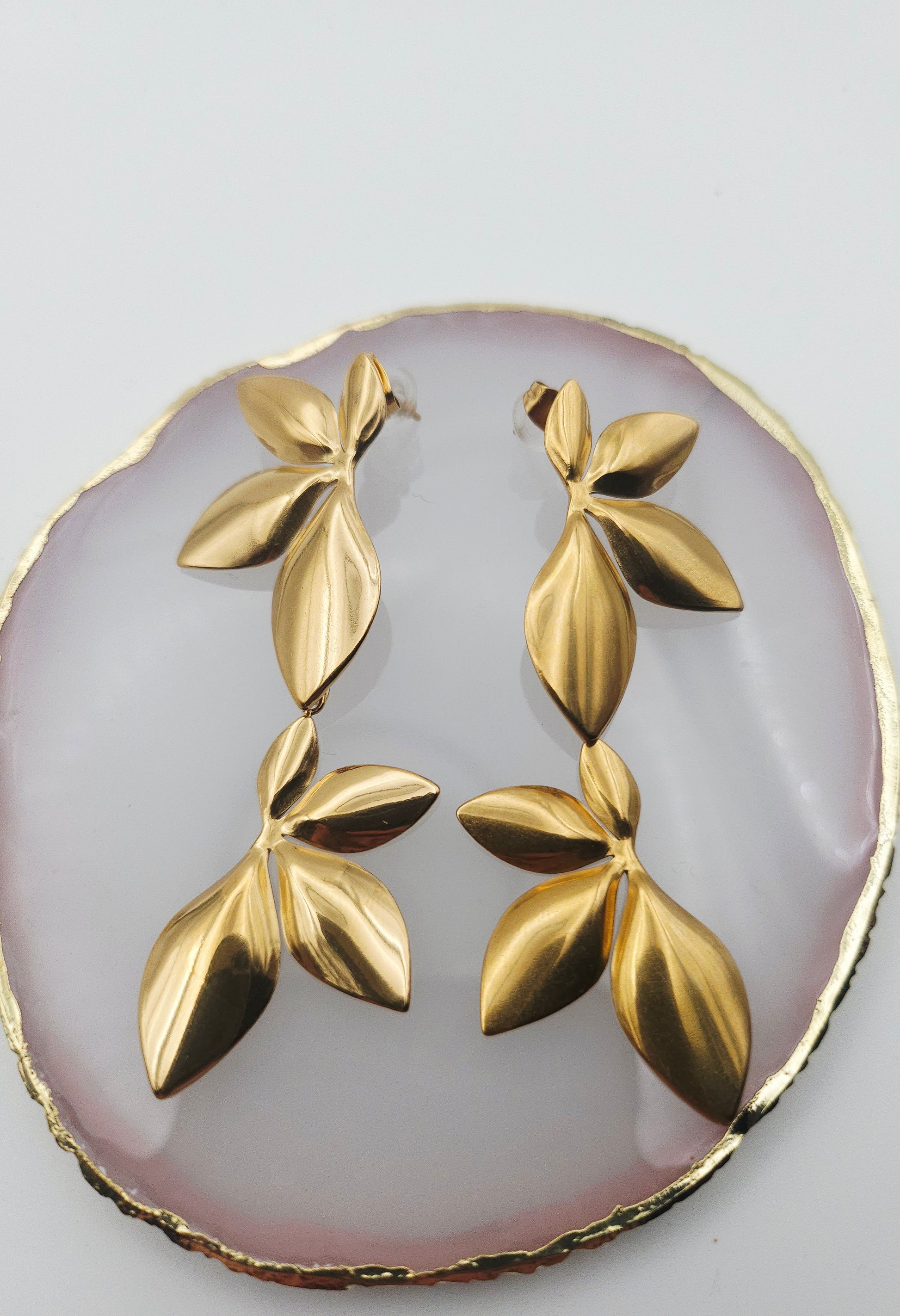Ces boucles d'oreilles sont composées de deux motifs en forme de feuilles, connectés de manière fluide. Les feuilles, finement ciselées et polies, brillent intensément et captent la lumière à chaque mouvement. Leur design à la fois organique et moderne crée un mouvement gracieux qui met en valeur le cou. 💖