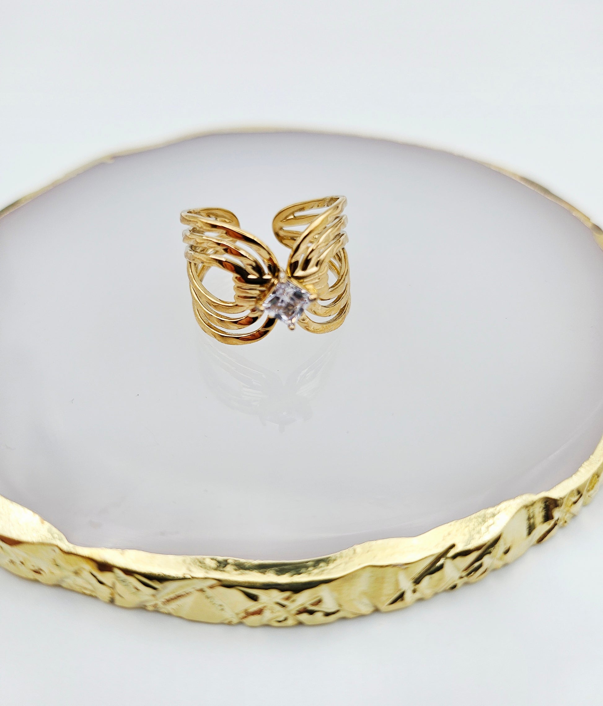 L'anneau est composé de plusieurs lignes dorées et entrelacées, créant une structure aérienne qui évoque les plis d'un ruban. Au centre de ce nœud, un petit cristal scintillant est serti, capturant la lumière et apportant une touche d'éclat à l'ensemble. 💎