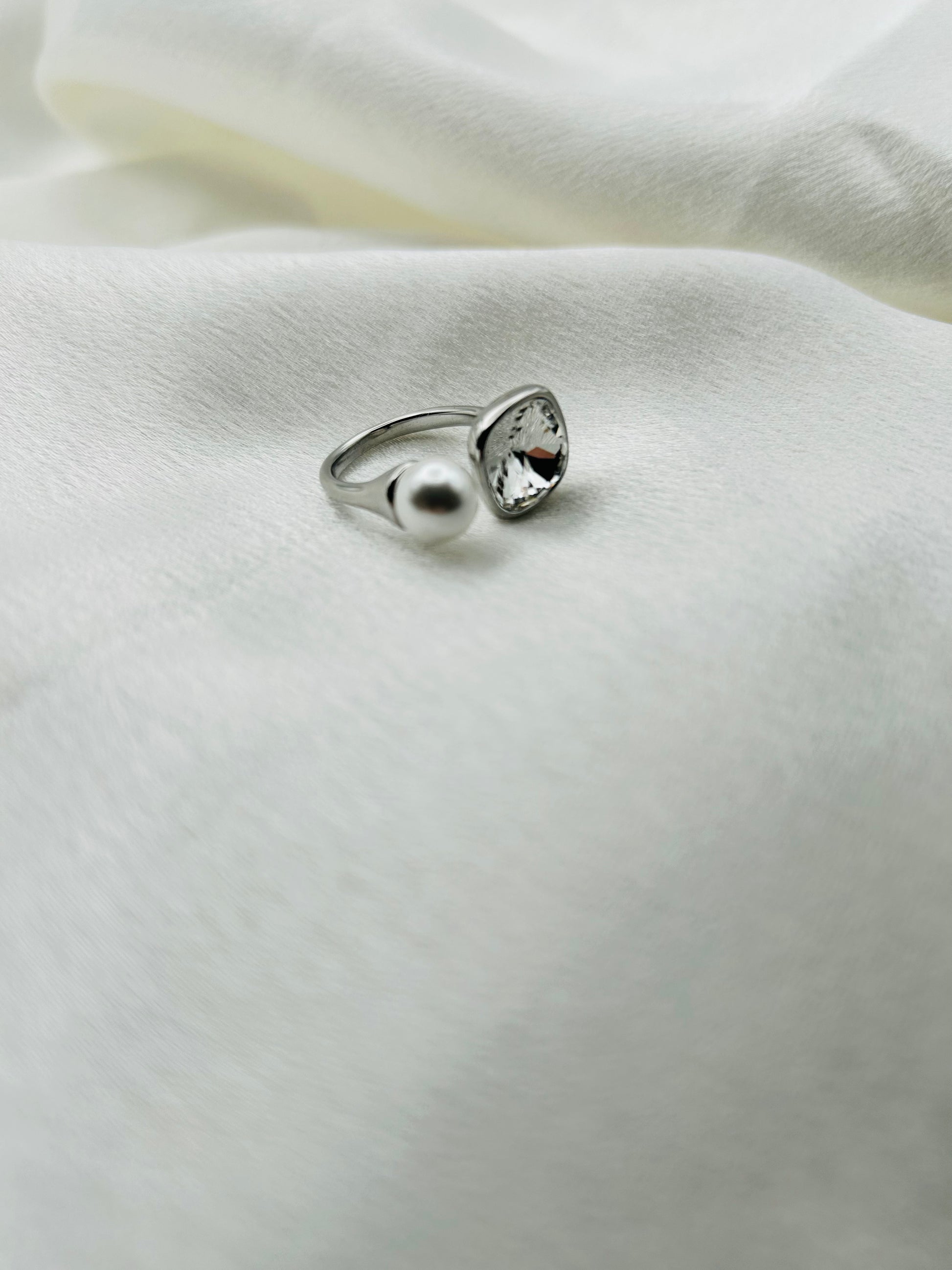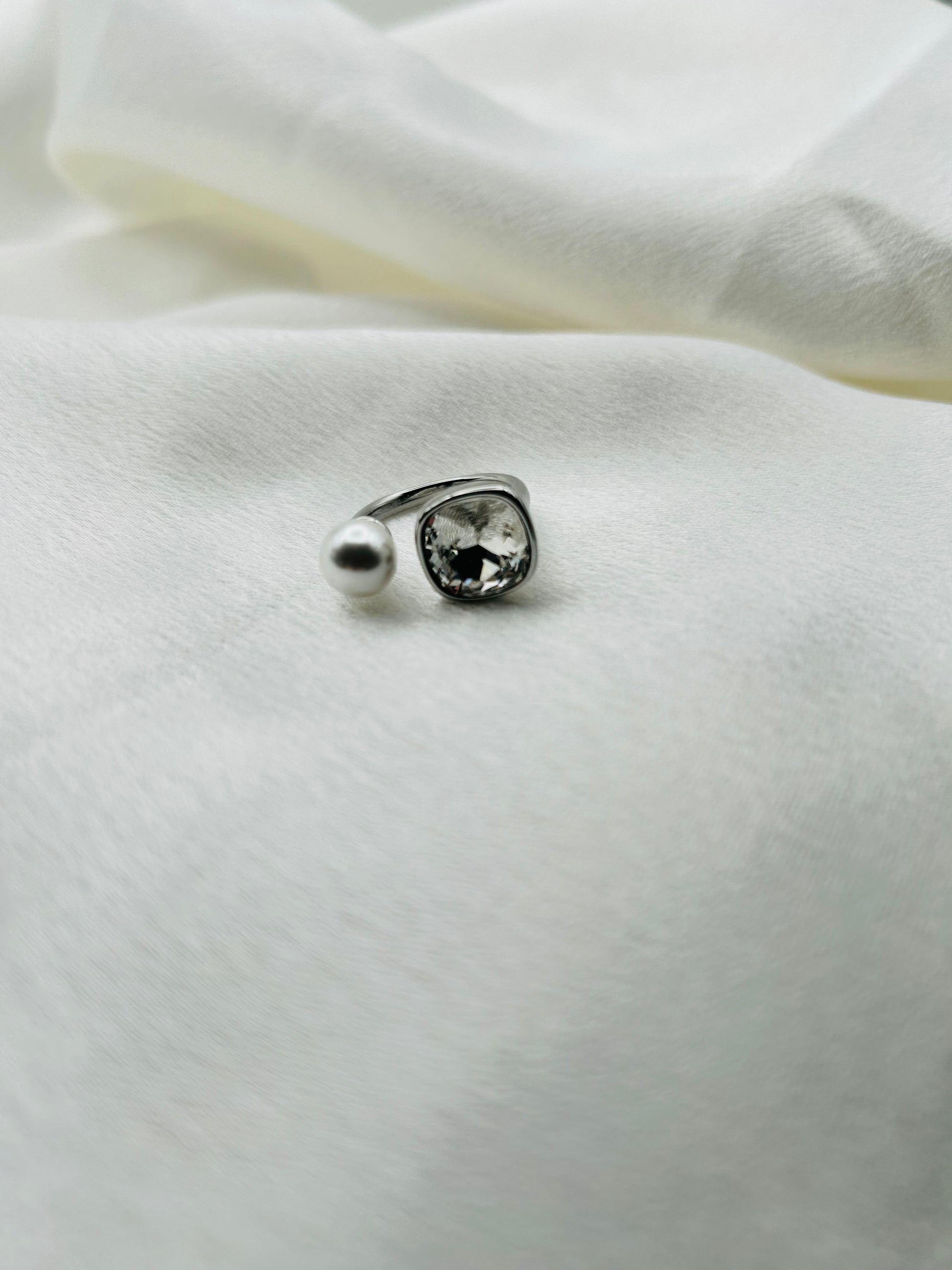 Découvrez la Bague Bianca, une pièce sophistiquée qui marie deux icônes de la bijouterie : la perle classique et l'éclat du cristal moderne. Un design ouvert et asymétrique, parfait pour celles qui aiment les contrastes élégants.