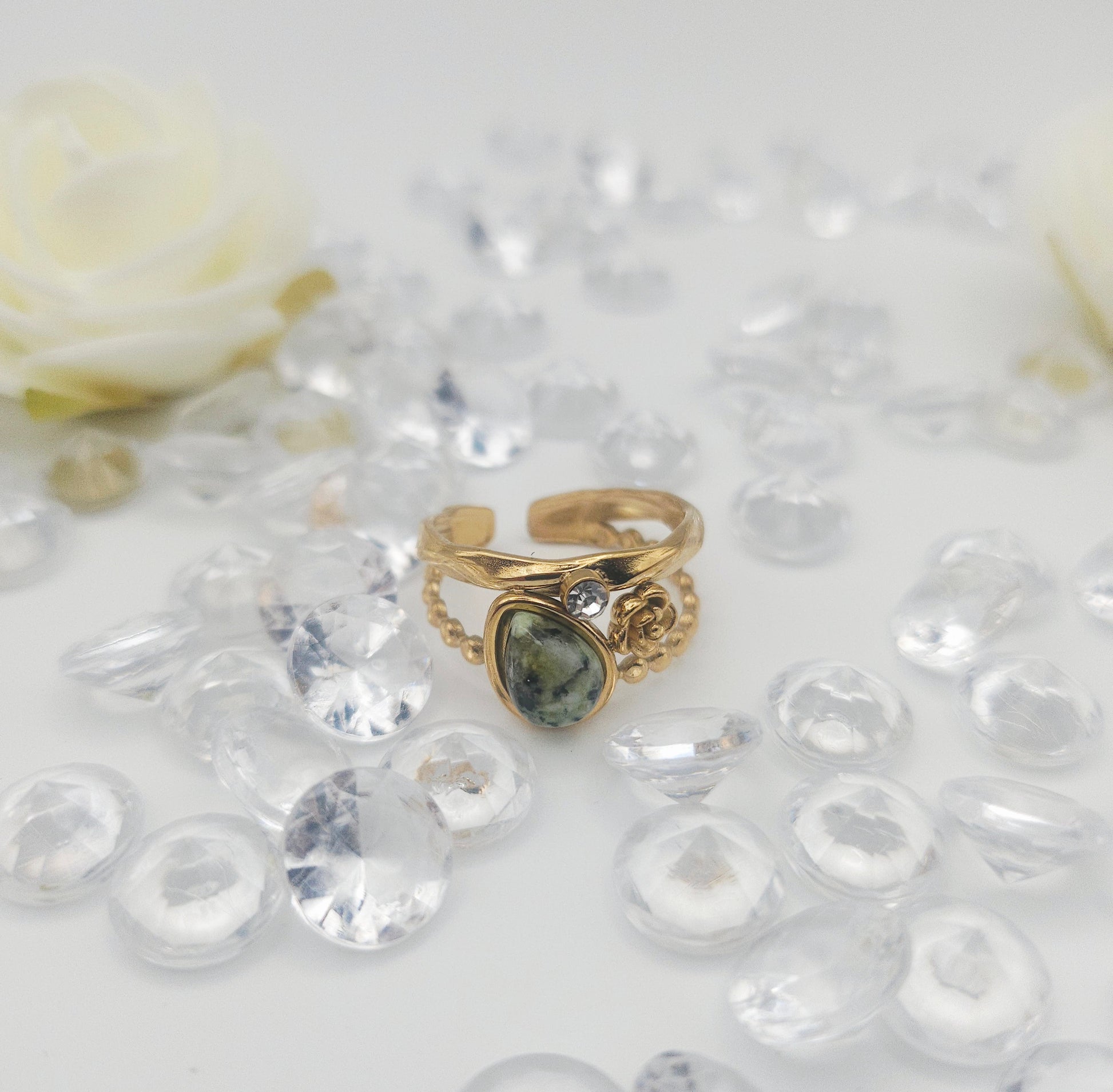 La bague Sia est une pièce unique qui allie délicatesse et caractère. Elle se compose de deux anneaux : l'un est texturé et orné d'un cabochon en pierre naturelle aux teintes vertes, et l'autre est fin et orné d'un petit brillant étincelant. ✨