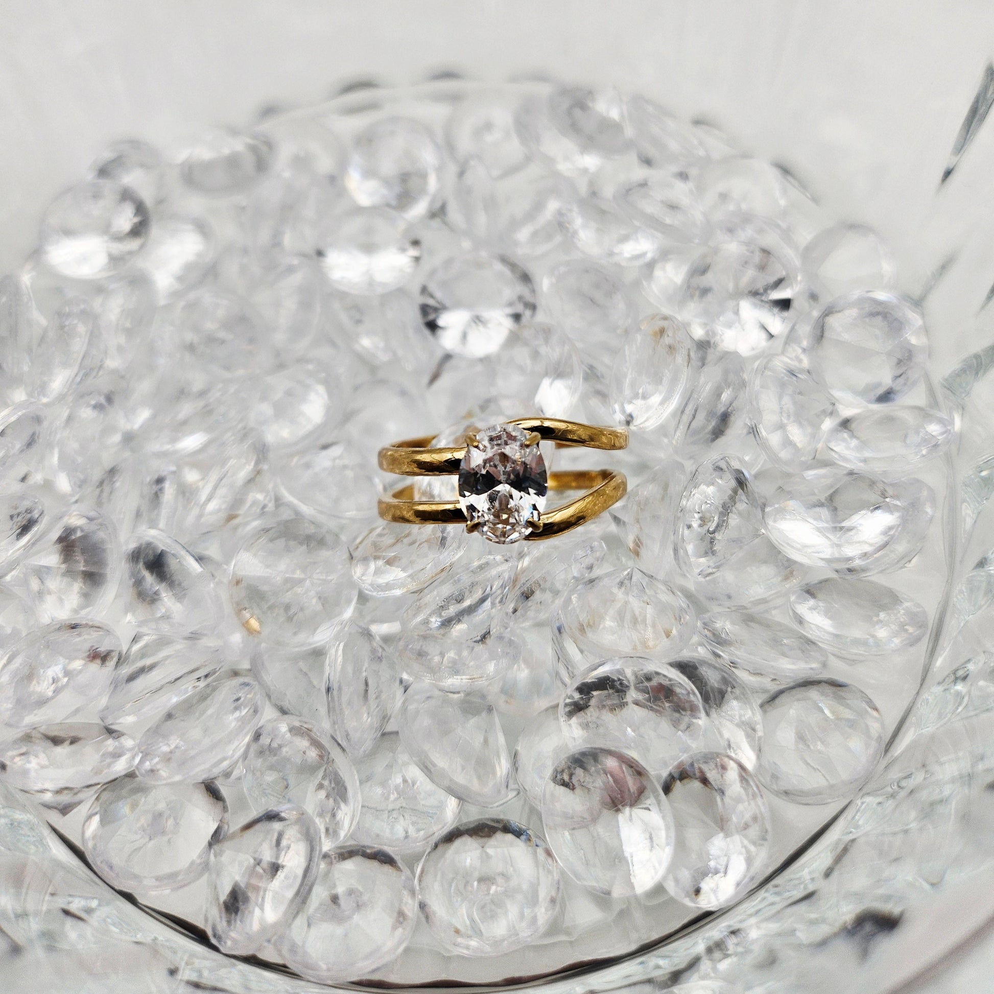 La bague est composée de deux anneaux dorés et fins qui se croisent délicatement au-dessus d'un cristal étincelant. Ce cristal, taillé en ovale, capte magnifiquement la lumière et apporte une touche de brillance subtile. L'ensemble crée une harmonie visuelle, à la fois simple et raffinée. ✨