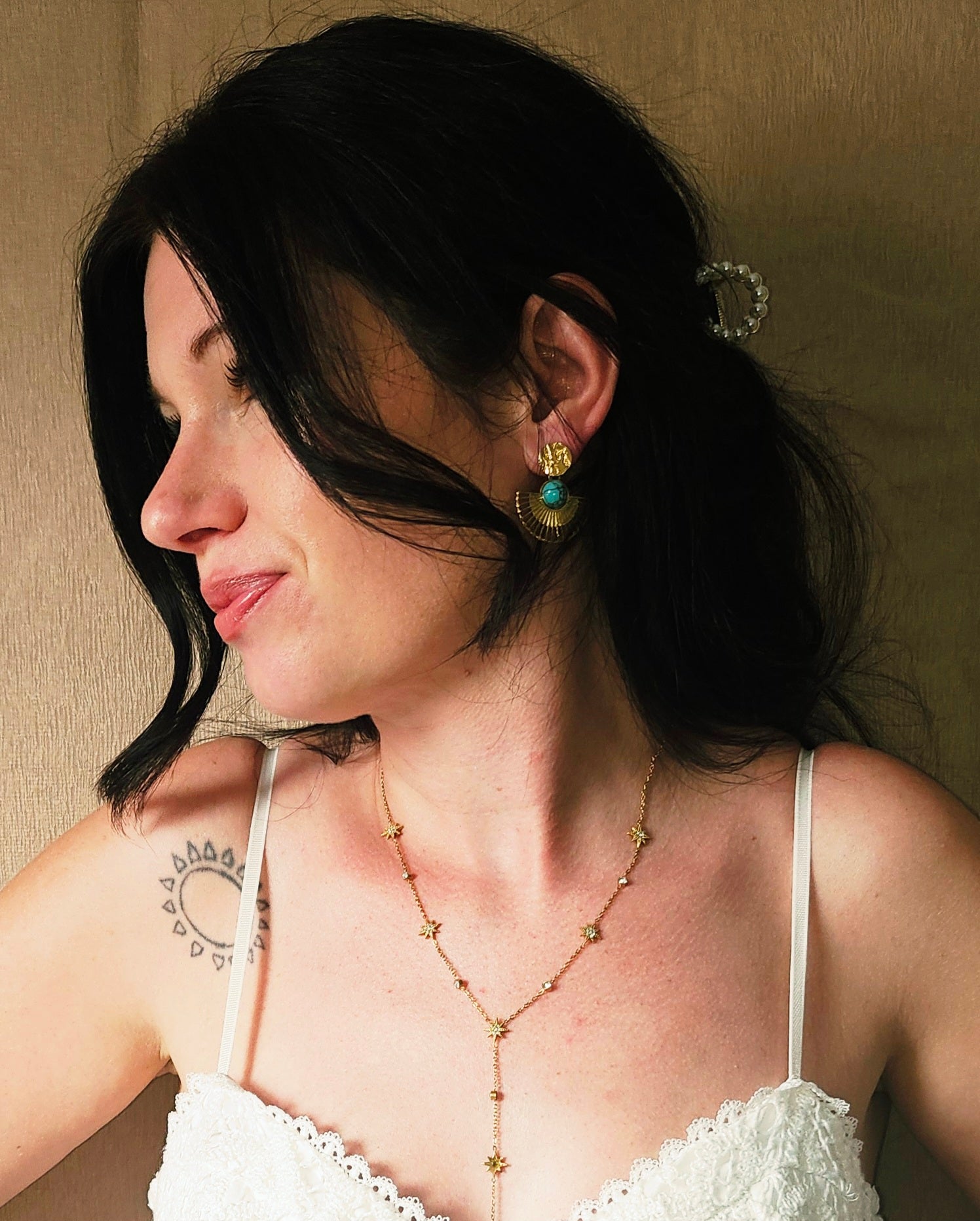 Chaque boucle d'oreille est composée d'un stud martelé, au relief unique, d'où part un éventail délicatement ajouré et doré. Au centre de cet éventail se trouve une magnifique pierre ronde d'un bleu-vert intense, imitant la turquoise. Ces pierres aux veines naturelles apportent une touche de mystère et d'élégance bohème. 💙