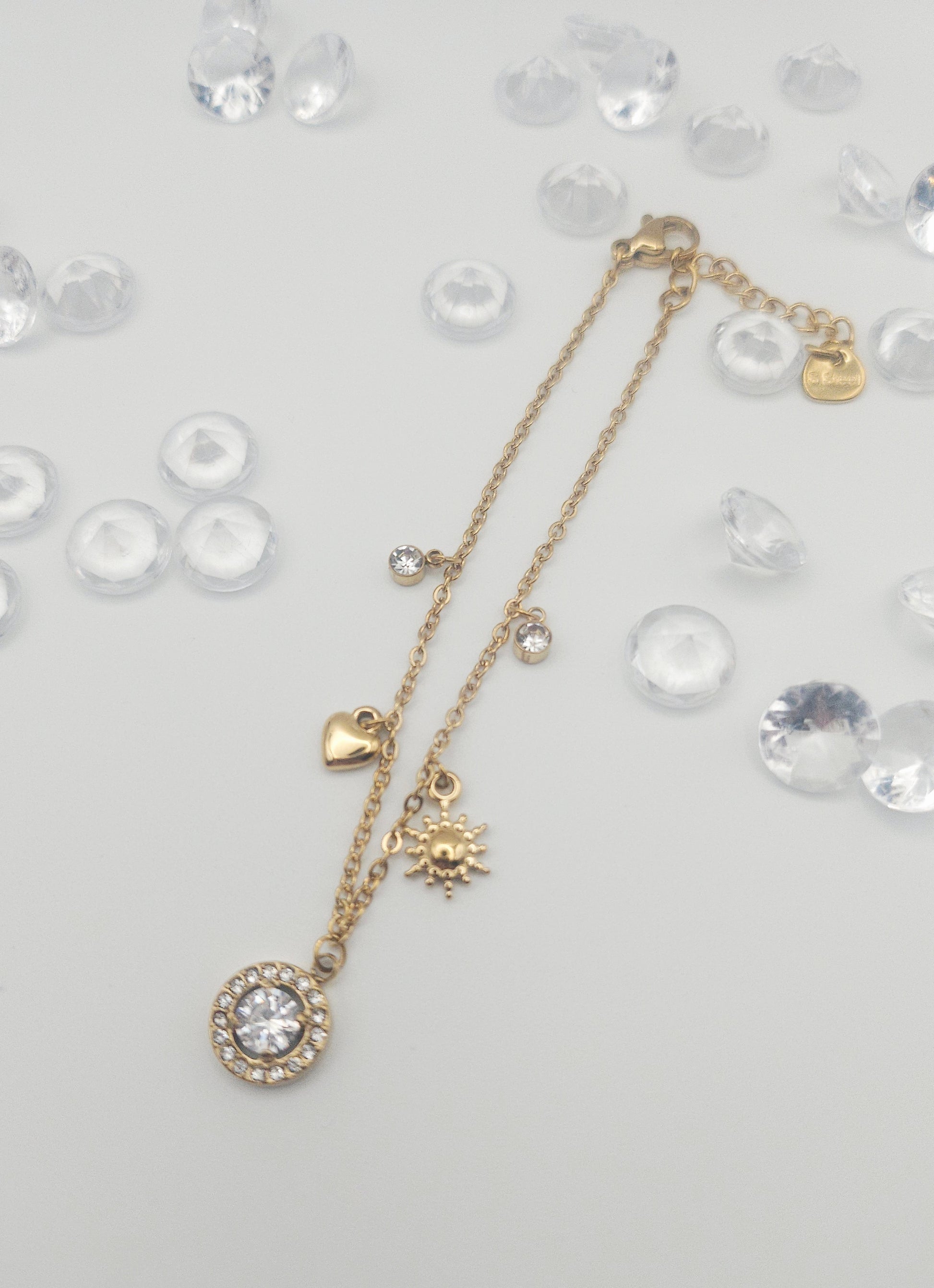 Sa chaîne fine dorée est agrémentée de plusieurs pendentifs symboliques et brillants : un cœur pour l'amour 💖, un soleil pour la lumière et la bonne humeur ✨, ainsi que des petites pierres de zircon étincelantes. 💎