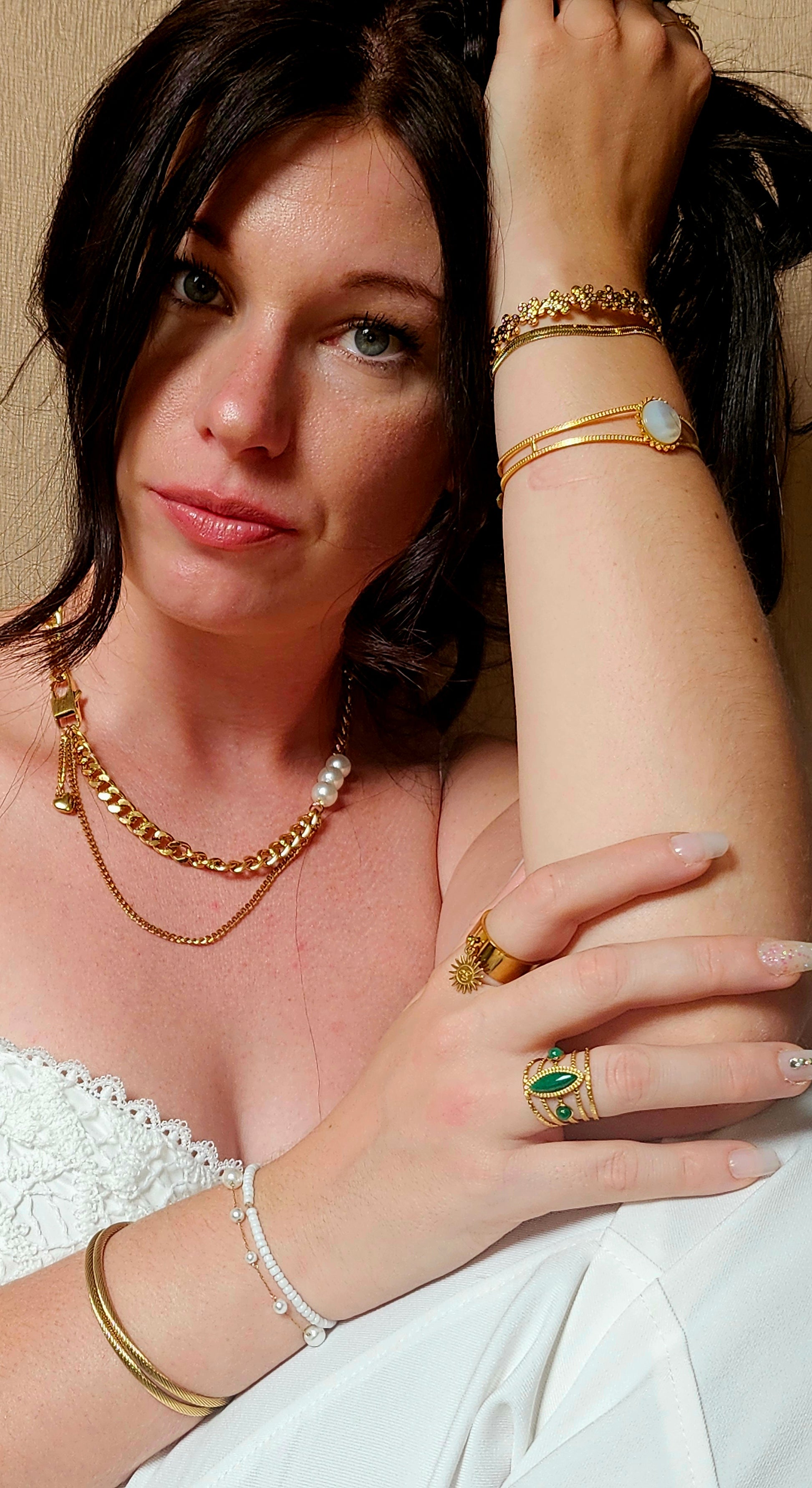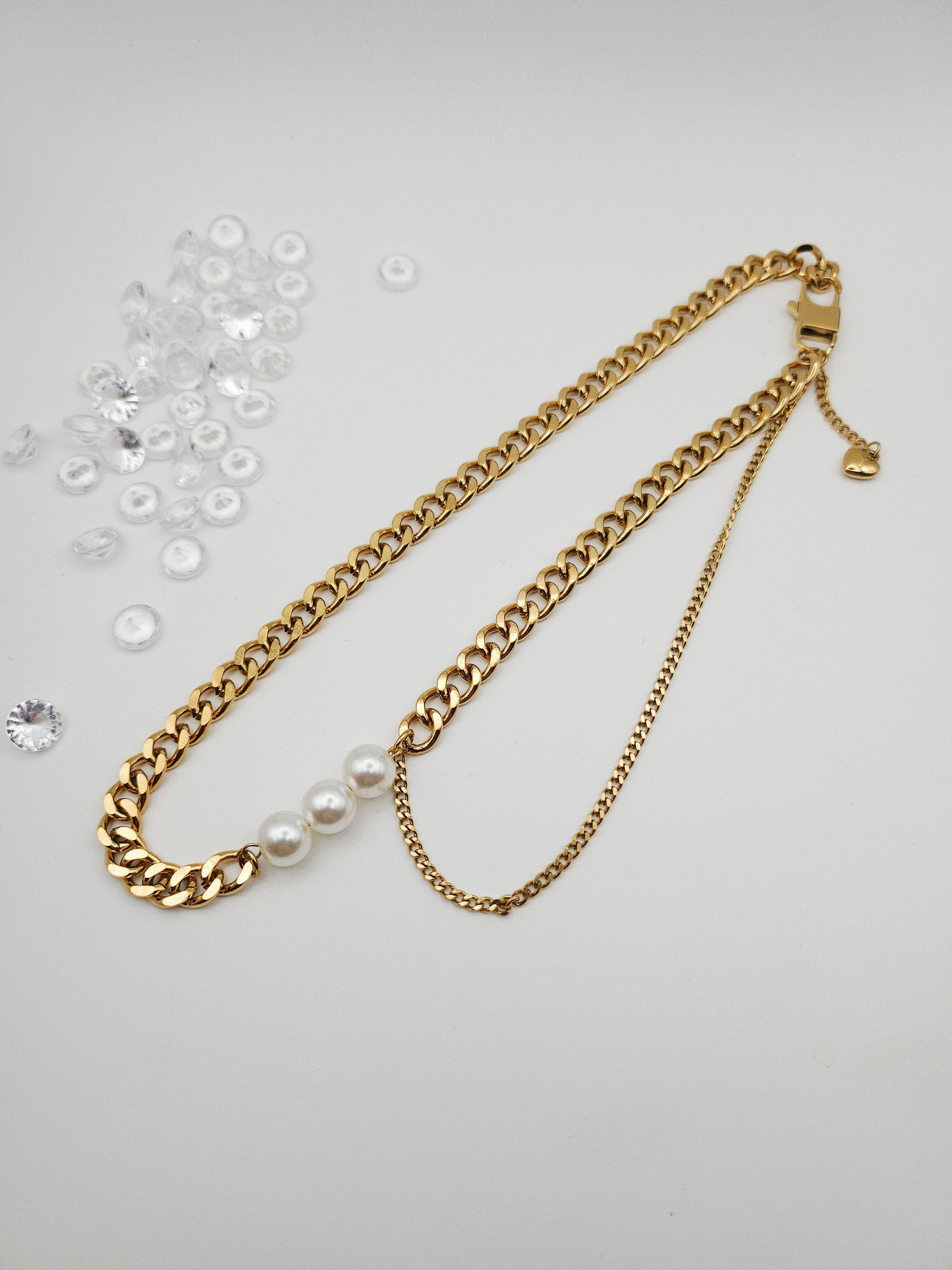 Découvrez l'élégance audacieuse du collier Adèle. Ce bijou unique joue sur les contrastes pour un style résolument moderne. Il est composé d'une chaîne gourmette dorée, à la fois tendance et affirmée, délicatement rehaussée par trois perles nacrées d'une élégance intemporelle. Son design asymétrique, complété par une chaîne plus fine qui apporte une touche de légèreté, en fait la pièce parfaite pour un look sophistiqué et mémorable. C'est le bijou idéal pour celles qui aiment allier caractère et finesse. 💛