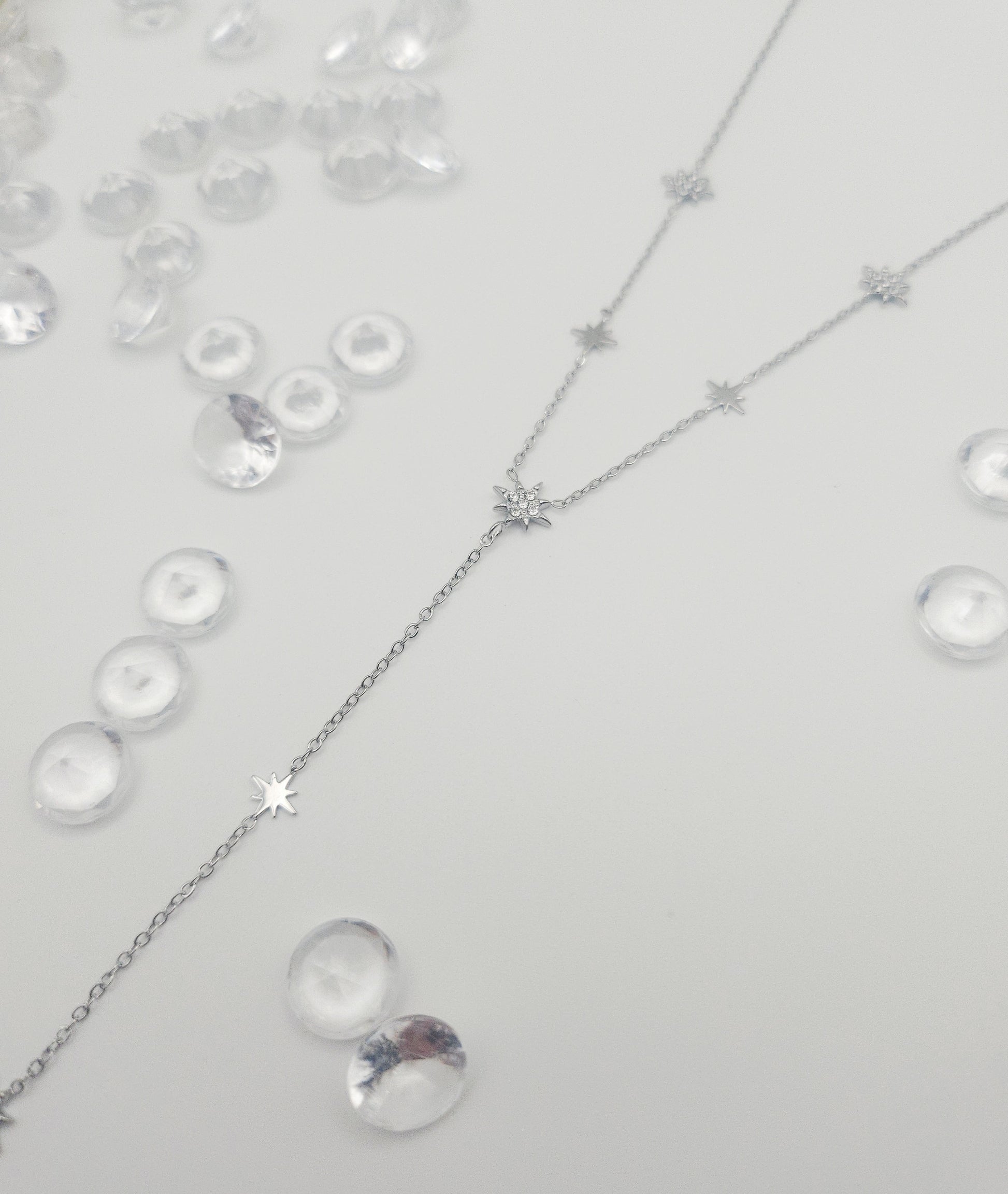 Son design collier-cravate descend délicatement sur le décolleté, parsemé de petites étoiles scintillantes. ✨