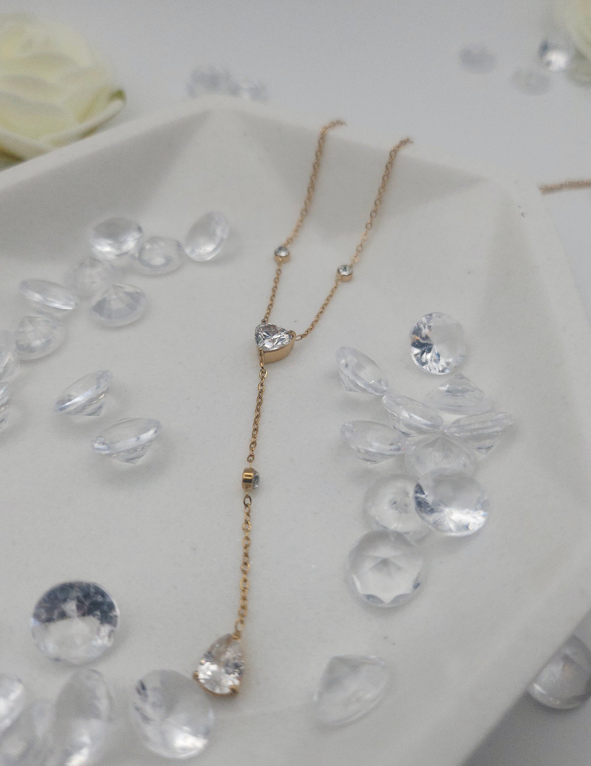Sa chaîne délicate à la finition dorée est ornée de plusieurs pierres de zircon étincelantes, créant un effet de cascade lumineuse. ✨
