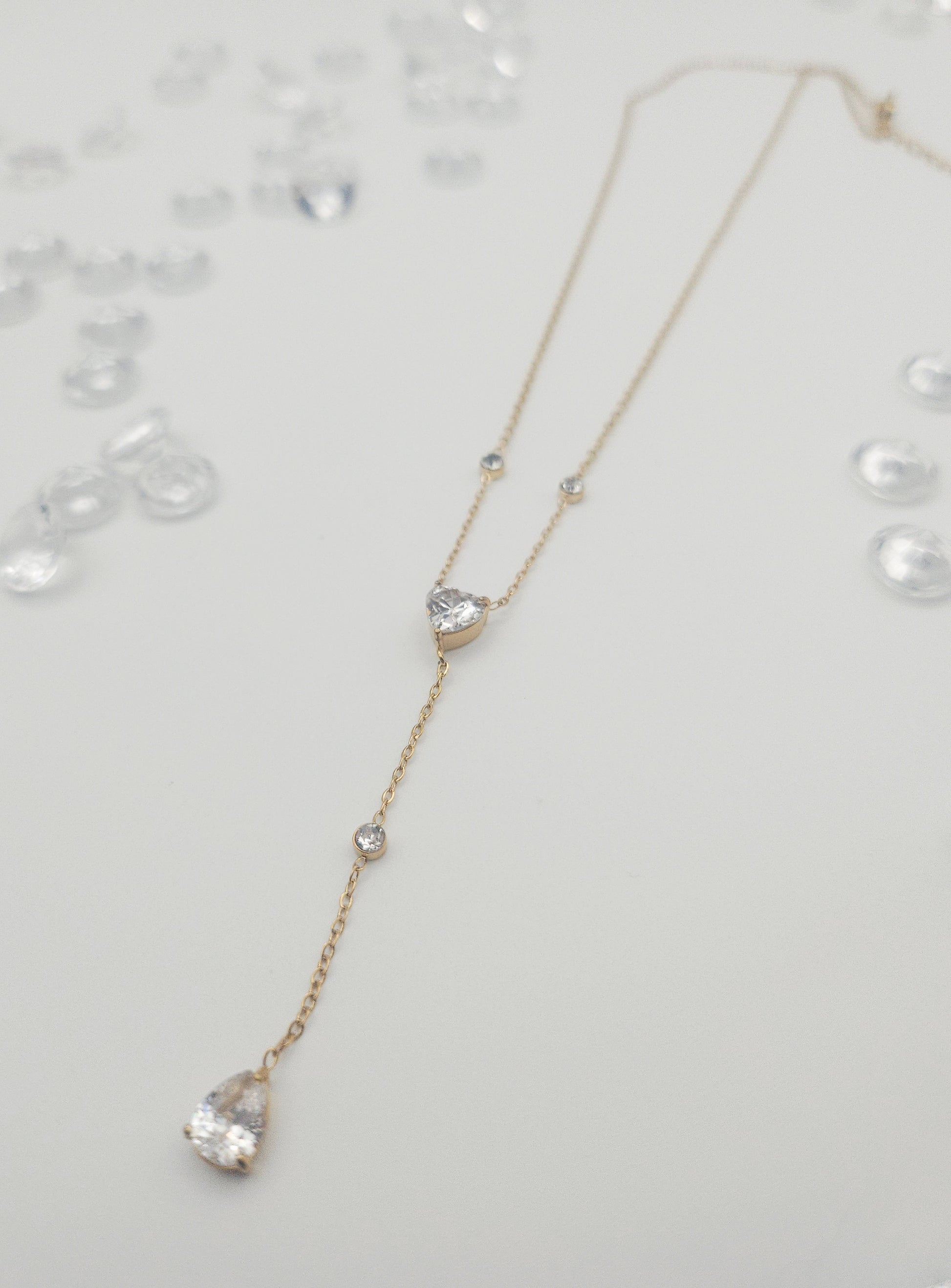 Un grand cristal en forme de cœur se trouve au niveau de la clavicule, tandis qu'un autre en forme de goutte orne l'extrémité.